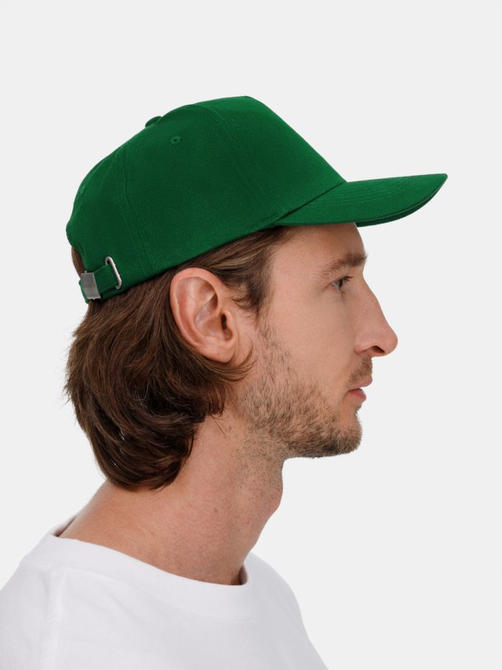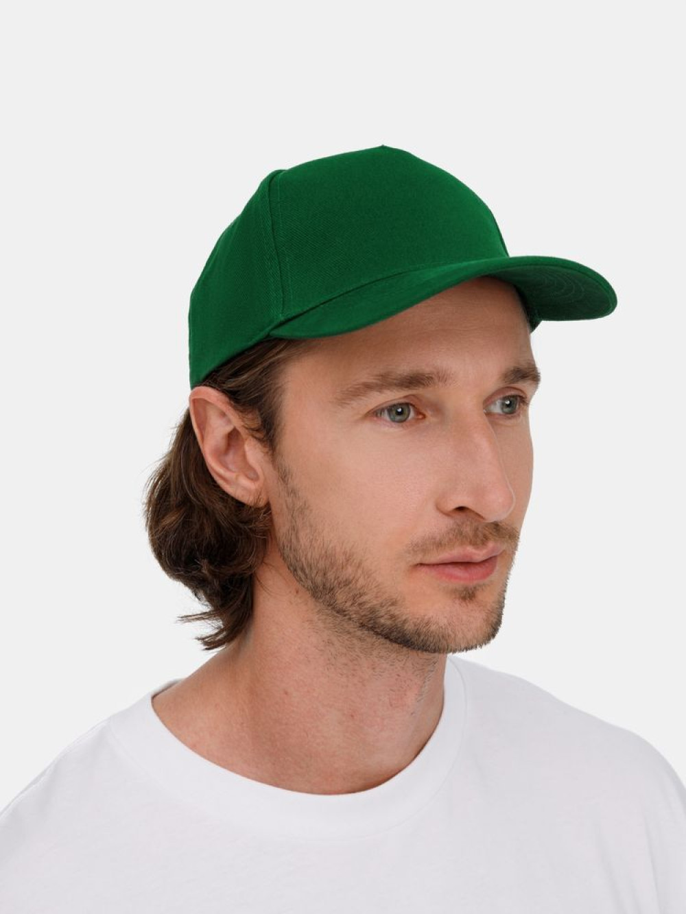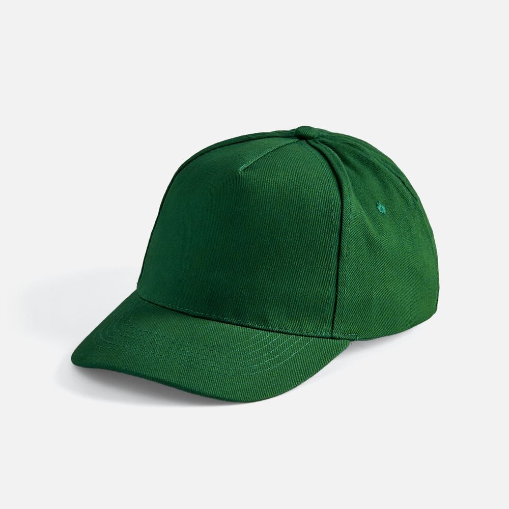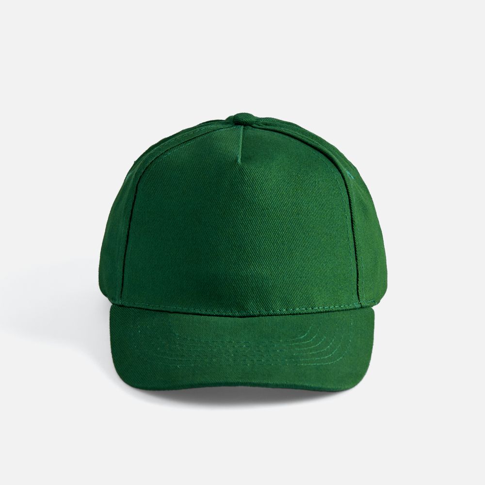 Модель бейсболки с 5-ю клиньями без лобового шва из плотного чесаного хлопка.