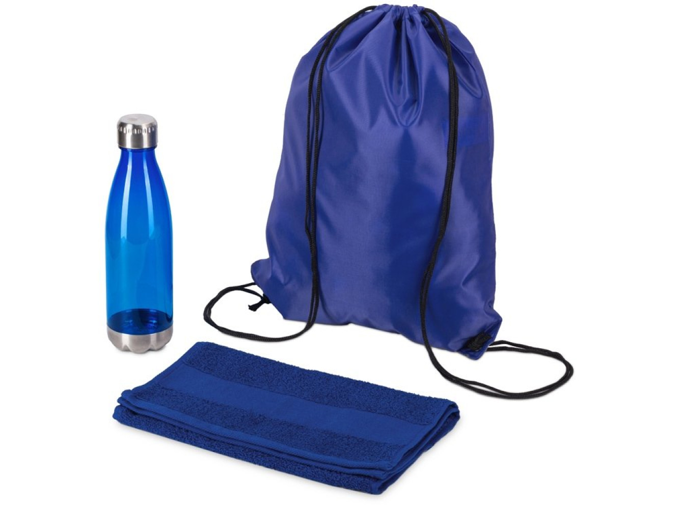 Универсальный спортивный набор будет актуален в любом виде спорта. Бутылка для воды позволит брать с собой не только воду, но и тонизирующие напитки или коктейли и поможет освежиться в любой момент. Тритан, из которого изготовлена бутылка, не искажает вкус и запах напитков, являясь абсолютно безопасным для человека. Натуральное полотенце из 100% хлопка не вызовет аллергии и не навредит коже. Вместительный рюкзак пригодится, чтобы всегда держать под рукой всё необходимое для тренировки. • объём бутылки: 700 мл • размер полотенца: 30х70 см • практичный набор для спортивного мерча