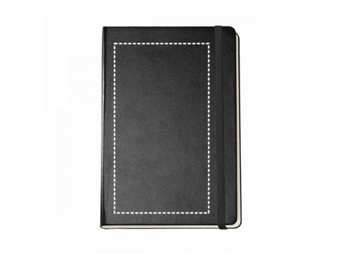Блокнот формата А5 с картонной твердой обложкой, с внутренним карманом сзади и с 160 страницами в линейку, цвета слоновой кости. Вид нанесения, рекомендуемый поставщиком: трансфер, трафаретная печать, уф- печать, горячее тиснение