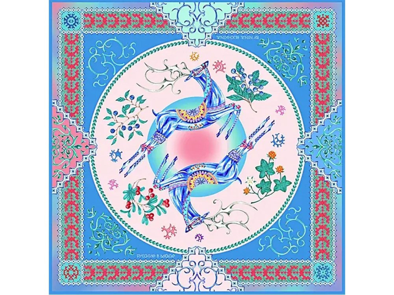 Дизайн платка «Северное сияние» от бренда «Русские в моде» навеян удивительным феноменом природы, а также сказаниями и художественной культурой народов Ямала. В центре композиции – сказочные олени, которые влюбляют в себя с первой секунды. Эти царственные животные несутся по залитому красками небу, символизируя Солнце, чистоту, обновление, духовность, созидание. Манящие и сочные чудо-ягоды разбросанные по полотну - визитная карточка Русского Севера. Платок обрамлен традиционными народными орнаментами – код, бережно передающийся из поколения в поколение, вобравший в себя благоговение перед могучей и прекрасной северной природой. Мы надеемся, что энергия платка «Северное сияние» привнесёт в Ваши будни немного волшебства! Аксессуар станет великолепным акцентом образа или памятным подарком. Над дизайном работали: Нина Ручкина.