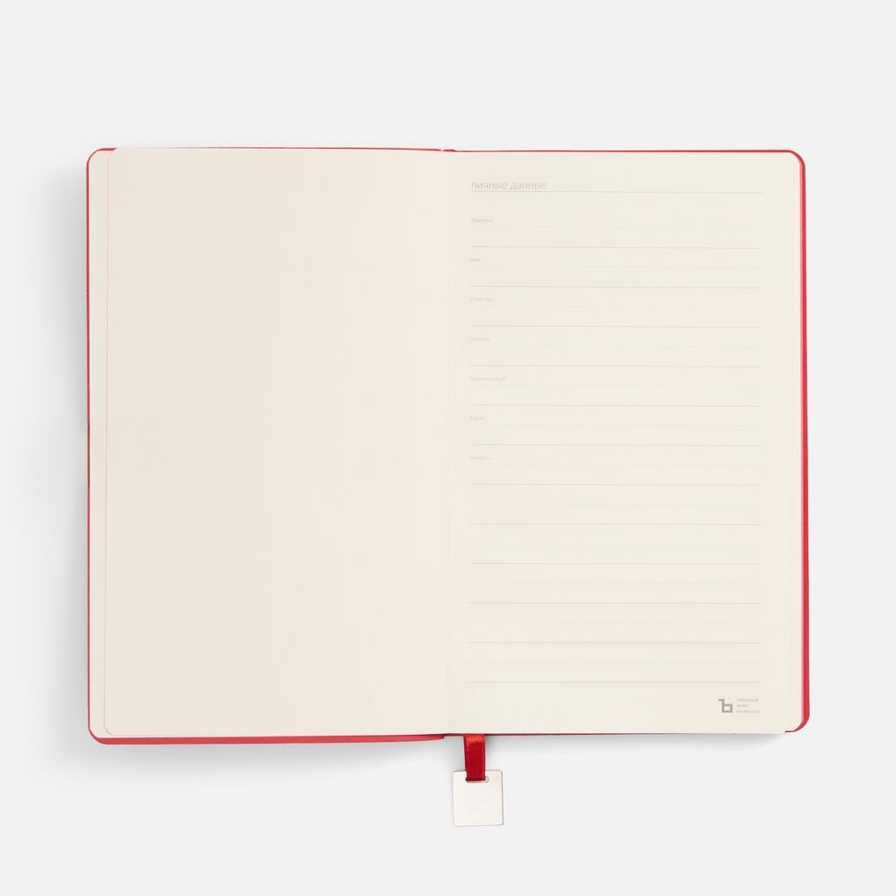 дополнен ляссе в цвет обложки с металлическим шильдиком.