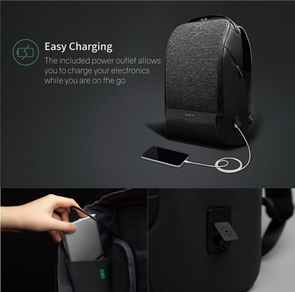 Вместительный водозащищенный рюкзак FlexPack Pro, обладатель премий iF Design Award 2019, Golden Pin Design Award, China Outstanding Industrial Design (CEID) Award, Governor Cup Industrial Design Excellence Award. Сделан из комбинации высокопрочных устойчивого к порезам и трению водоотталкивающих материалов: полиэстера и ткани многослойного плетения разных типов (нейлон, полиэстер и стекловолокно) черного и темно-серого цветов. Не требует специального ухода. Конструкция рюкзака достаточно жесткая, не деформируется. Внутри рюкзака есть специальный карман, в который можно поместить powerbank, т к в него приходит USB-кабель (600 мм, 0,5-0,7 А, 5В), соединенный с портом на внешней стороне рюкзака для легкого подключения к смартфону. Это оригинальная запатентованная система зарядки K EasyCharging 1.0 с помощью USB-порта, расположенного в борту рюкзака, и кабеля, идущего к powerbank, что делает мобильную зарядку более удобной. Детально продуманная организация отделений позволяет грамотно распределить вес. Самые тяжелые предметы располагаются ближе к спине. Ноутбук надежно фиксируется и не перемещается при ходьбе. Внутри рюкзака есть 5 дополнительных карманов на молниях. Специальная анатомическая конструкция вентилируемых мягких спинки и лямок и дополнительная поперечная лямка на магнитной застежке снижает нагрузку на плечи и спину, вес рюкзака воспринимается на 20-25% легче, чем при использовании стандартных моделей рюкзаков. • Размер рюкзака 47х34х18 см • Объем 18 л • Вес 1330 гр Ключевые моменты: • Водонепроницаемая молния с фиксацией кодового замка TSA007 с функцией таможенного досмотра • Карман для powerbank с USB-кабелем (600 мм, 0,5-0,7 А, 5В) • Рюкзак оснащен стальным тросом, которым можно обхватить неподвижный предмет и затем зафиксировать в кодовом замке. Внутреннее наполнение: • Отделение для ноутбука диагональю до 15,6” • 5 дополнительных карманов на молниях 3 кармана 15-17х21-26 см 2 боковых кармана с отделениями для телефона и мелочей - 11,5х20 см Внешняя сторона: • 2 easy access кармана на водонепроницаемых молниях - 22х12 см • Петля для очков или наушников на лямке • Удобная ручка из высококачественной прочной резины