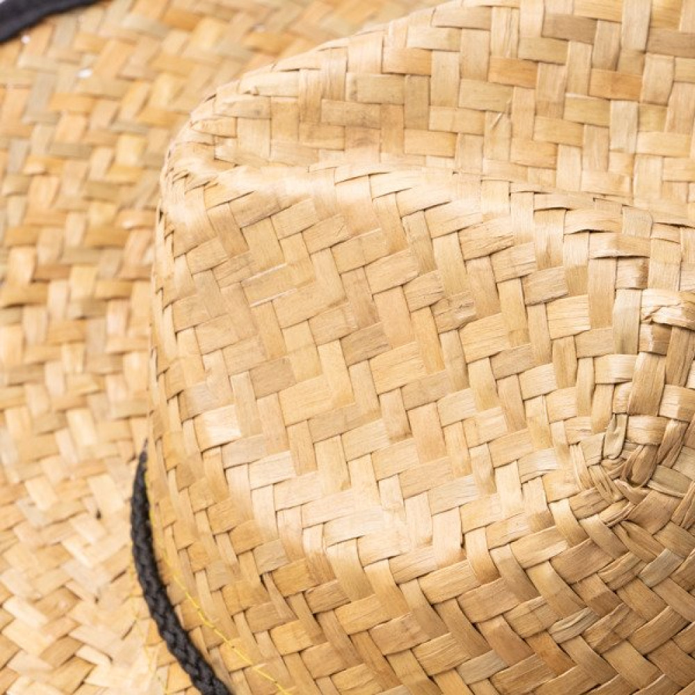 Шапка из натуральной соломы с усиленной полиэстеровой отделкой по краям и регулируемой кулиской сверху, сочетающейся по цвету с отделкой.