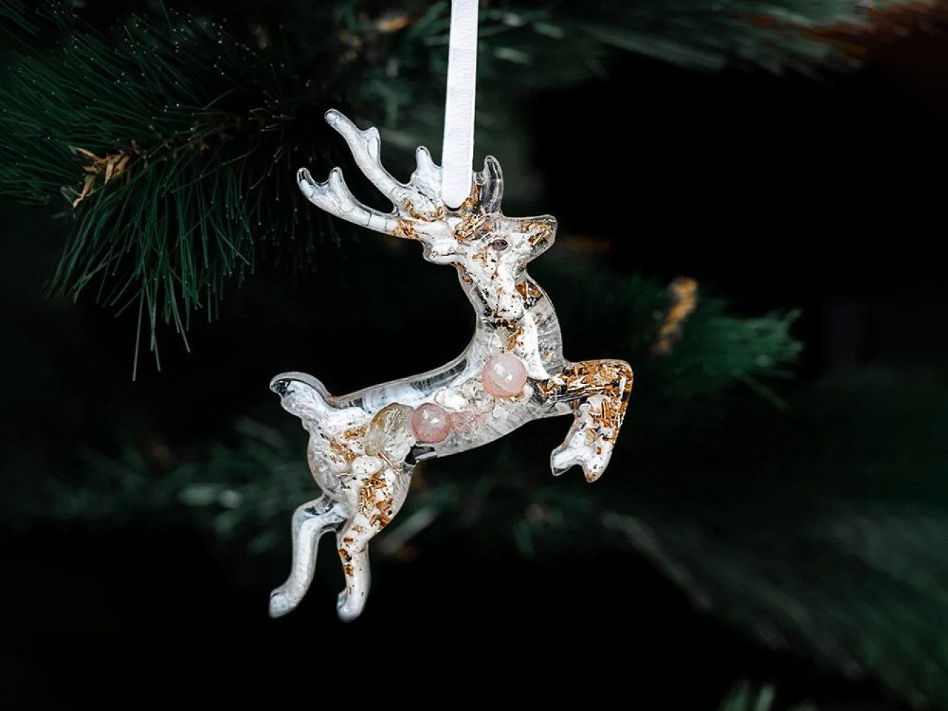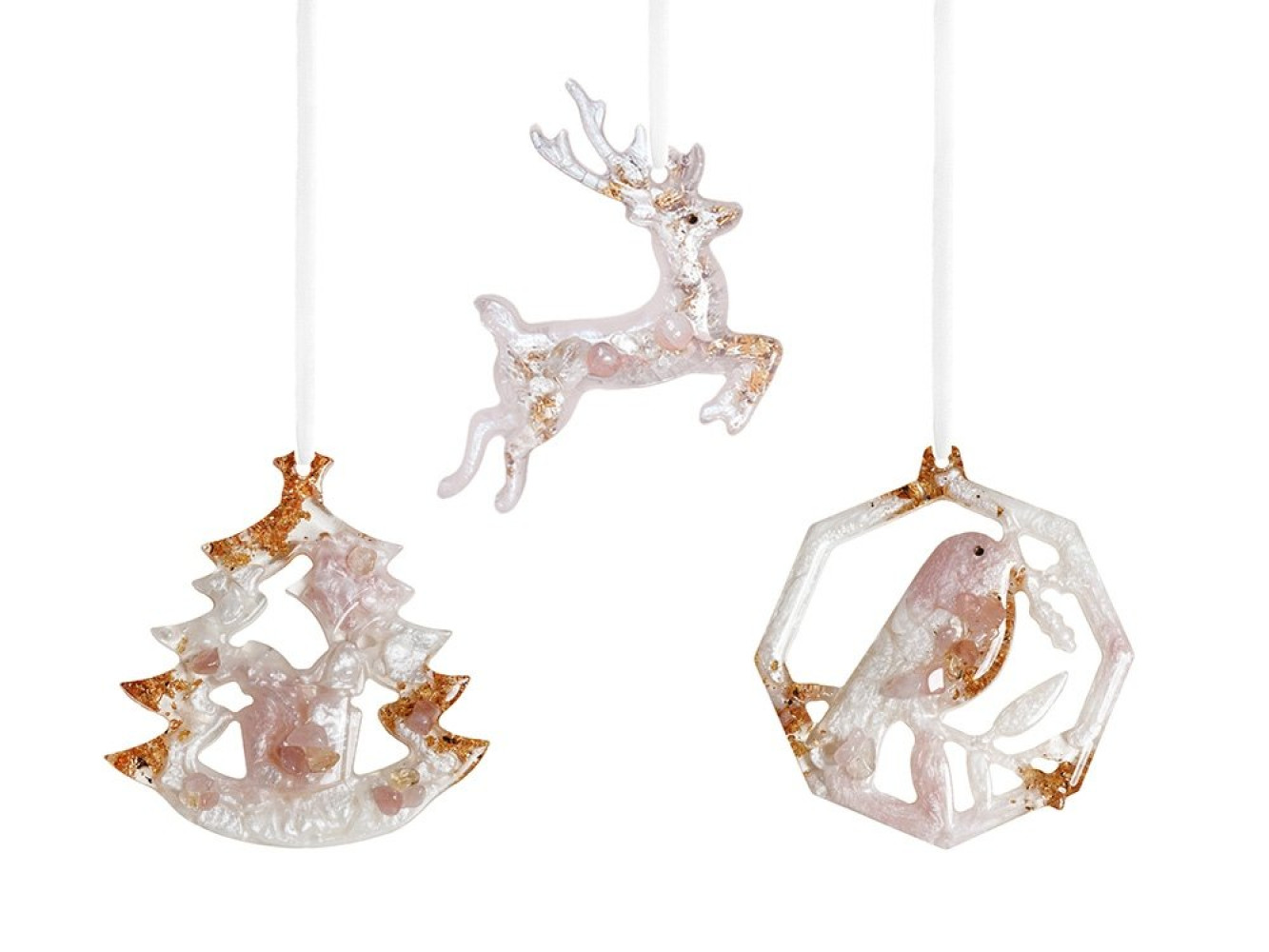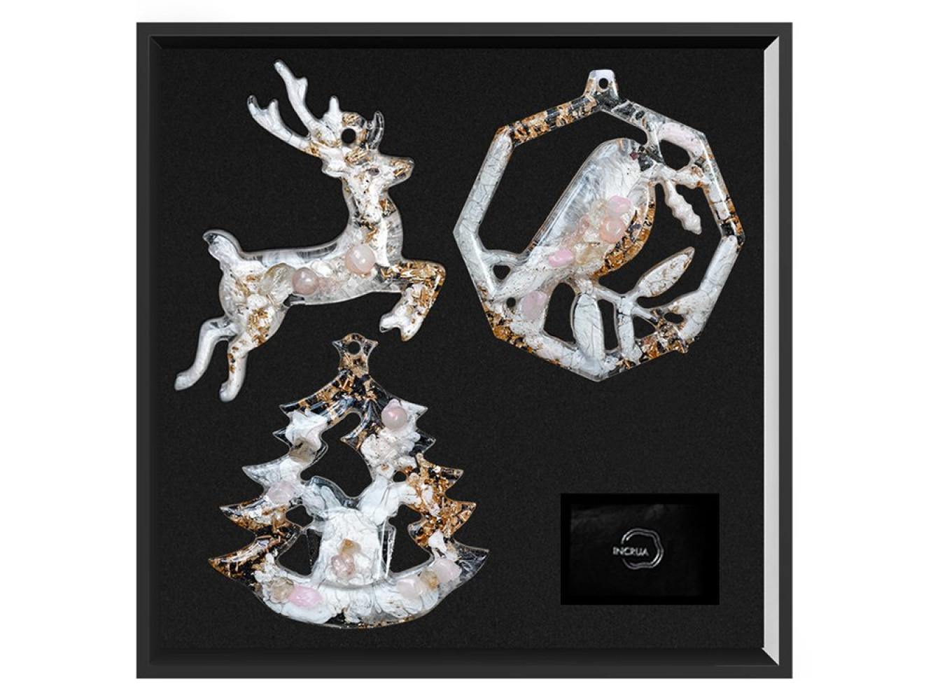 Набор из 3-х елочных игрушек: в форме оленя, снегиря и елки. Игрушки выполнены из ювелирной эпоксидной смолы и украшены галтовкой из натуральных минералов. Игрушки бережно упакованы в стильную коробку из плотного премиального картона с индивидуальным ложементом, который надёжно фиксирует игрушку. Такой презент не требует дополнительной упаковки и готов порадовать своего обладателя. Для вашего удобства к каждой игрушке прилагается элегантная ленточка, с помощью которой вы легко сможете подвесить их на ёлку.