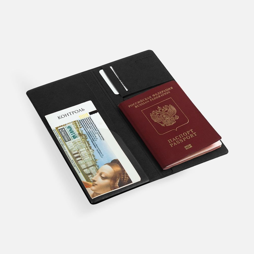 Органайзер из искусственного материала, имитирующего сафьяновую кожу, имеет 5 отделений: для билетов, паспорта, визиток или кредитных карт.