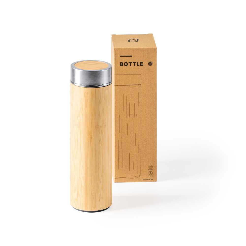 Термос из нержавеющей стали с двойными стенками, завинчивающейся крышкой и съемным внутренним фильтром. Внешняя стенка из натурального бамбука. Емкость 500 мл.
