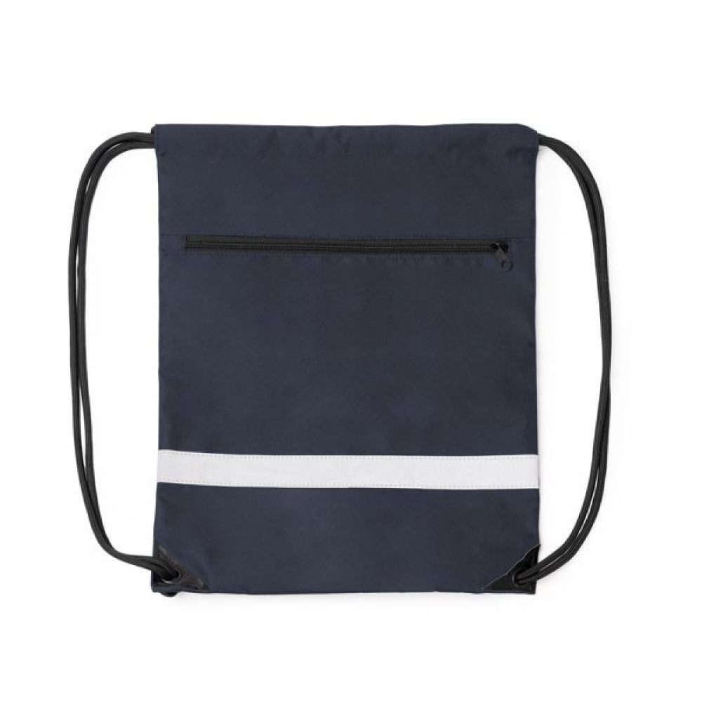 Рюкзак на кулиске регулируемый из RPET 300D. Передний карман с застежкой-молнией и горизонтальной светоотражающей полосой, которая обеспечивает большую видимость. Кроме того, его углы усилены искусственной кожей.