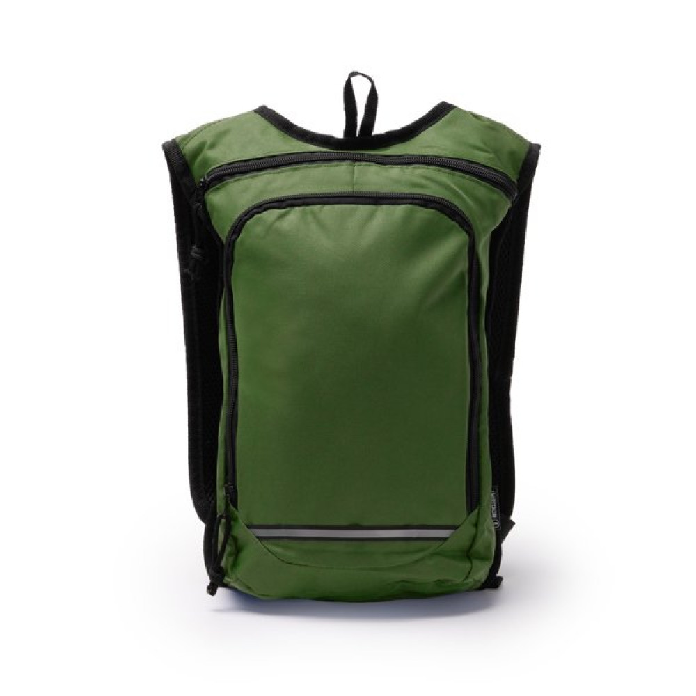 Рюкзак из 600D RPET. Основное отделение с верхней застежкой-молнией и двумя отверстиями для питьевых шлангов. Включает большой внешний передний отсек с застежкой-молнией. Обе застежки-молнии оснащены черным язычком. Имеет горизонтальную светоотражающую полосу спереди, которая улучшает видимость. Мягкие ручки и спинка.