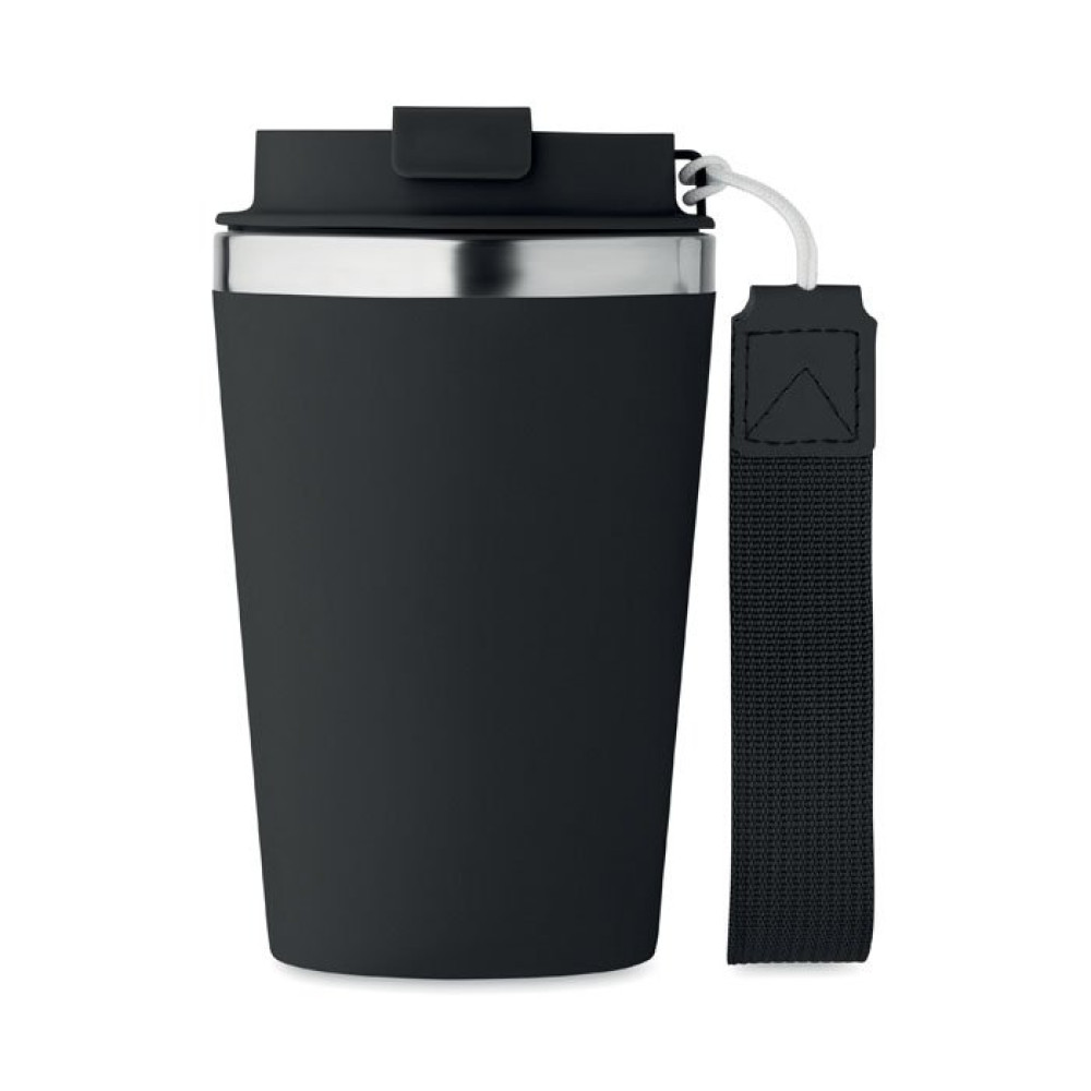 Термокружка с двойными стенками из переработанной нержавеющей стали (90%) и обычной нержавеющей стали (10%) с внешним покрытием из переработанного полипропилена с ремешком для запястья из RPET. Объем: 350 мл. Герметична.