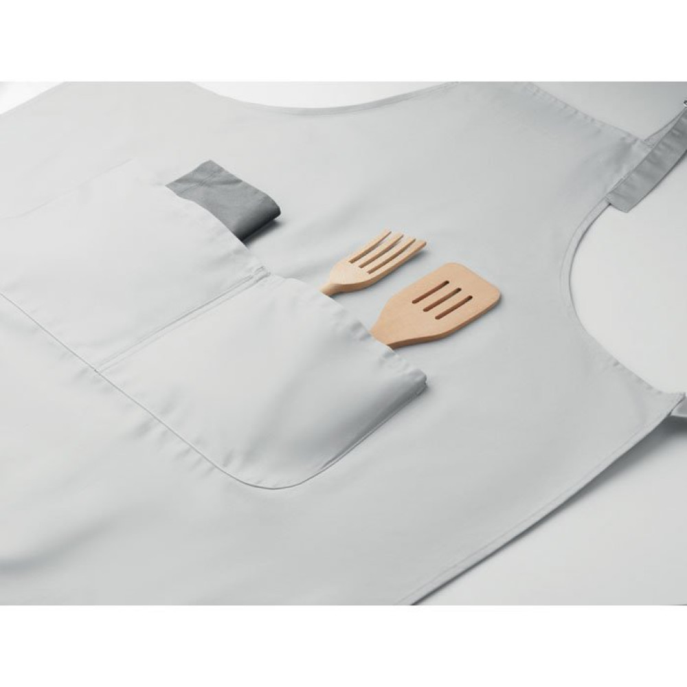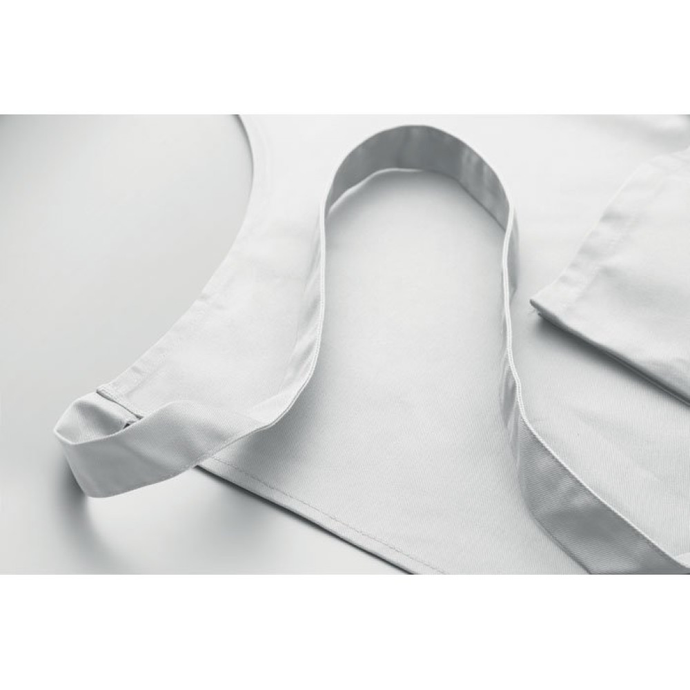 Длинный кухонный фартук из поликоттона 240 г/м² (35% хлопок, 65% полиэстер) с двумя передними карманами и регулируемым ремешком с металлической пряжкой.