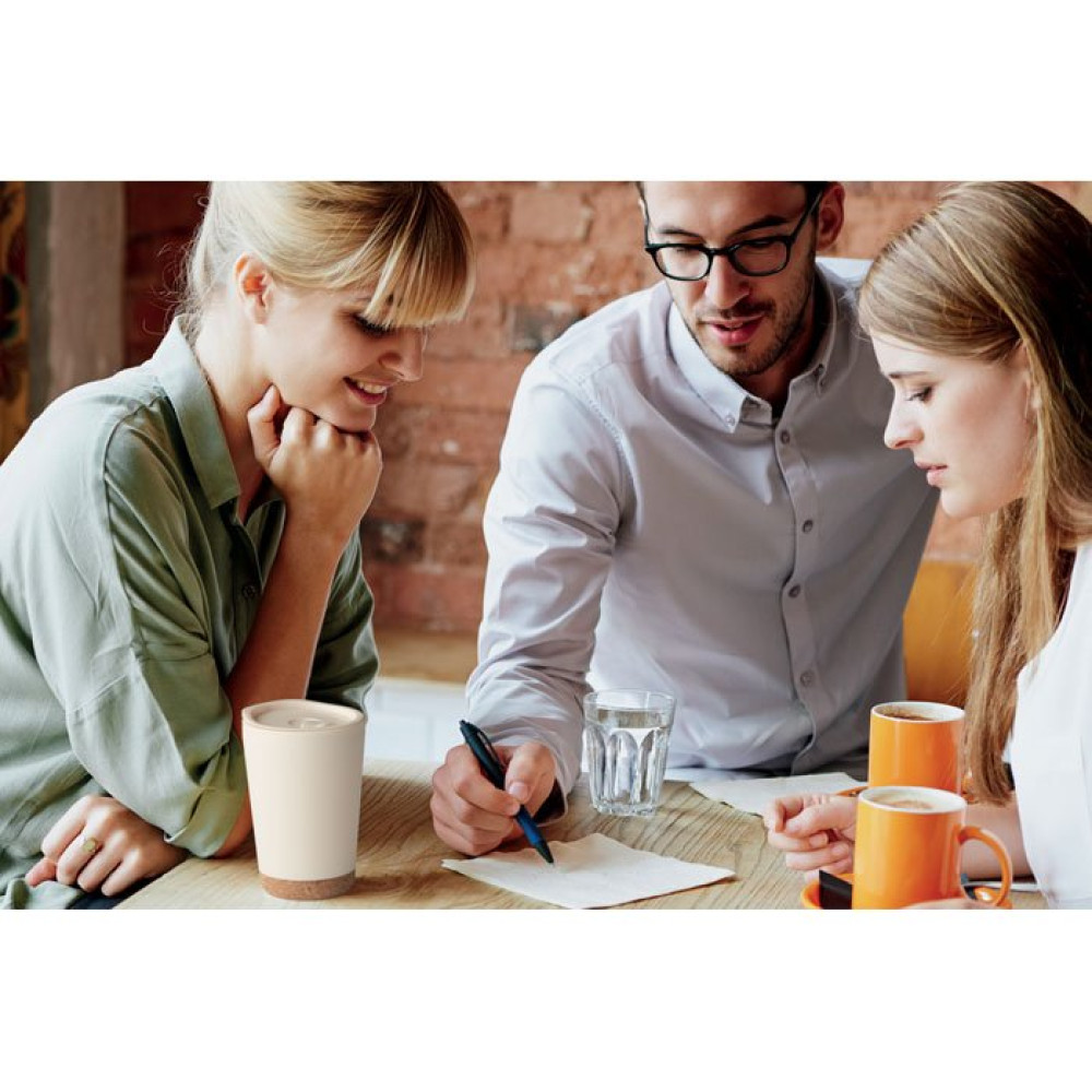 Термокружка с двойными стенками из полипропилена и пластиковой крышкой. Пробковое основание. Объем: 300 мл.