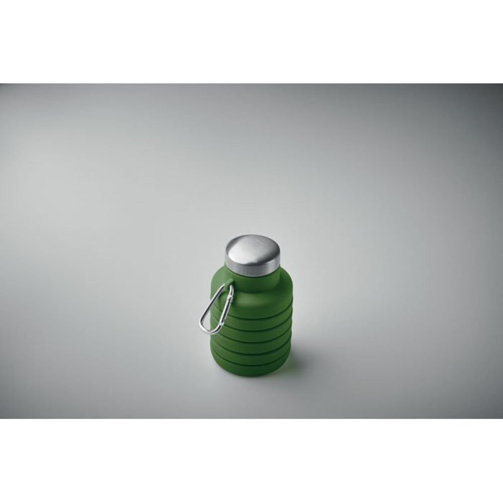 Складная силиконовая бутылка с крышкой из нержавеющей стали и алюминиевым карабином. Карабин не предназначен для альпинизма (непрофессиональное использование). Объем: 500 мл.