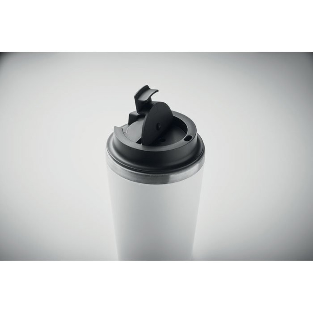 Термокружка с двойными стенками. Верхняя часть из полипропилена, внутренняя стенка из переработанной нержавеющей стали 90% и 10% нержавеющей стали с керамическим покрытием. Герметична. Объем: 350 мл.