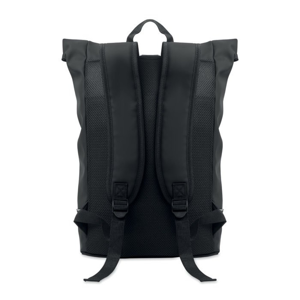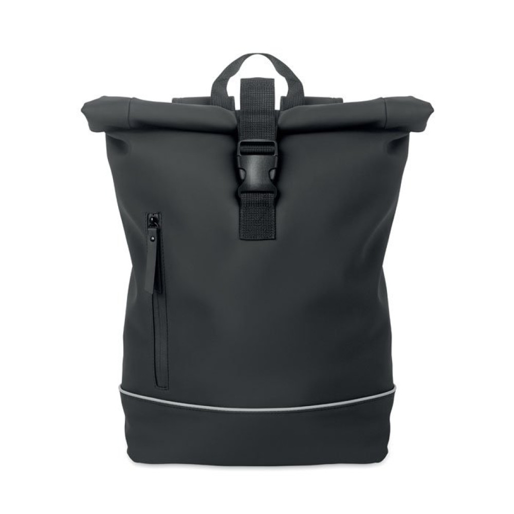 Рюкзак для ноутбука 15 дюймов из мягкого полиуретана с застежкой rolltop и светоотражающей полосой. Мягкая спинка, усиление дна, водонепроницаемый передний карман на молнии. Подкладка из полиэстера 210D RPET.