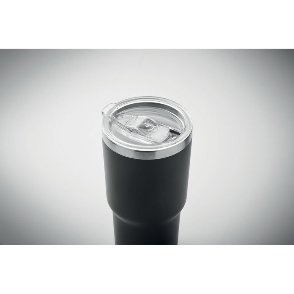 Стакан из переработанной нержавеющей стали с двойными стенками (90% из переработанной нержавеющей стали и 10% из нержавеющей стали). Крышка с выдвижным отверстием для глотка. Не пропускает воду. Объем 500 мл
