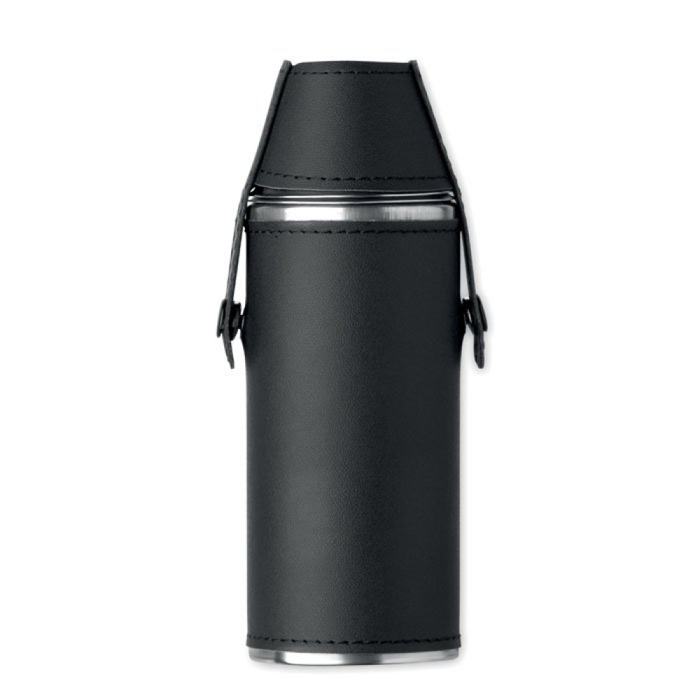 Фляжка из нержавеющей стали с поверхностью из искусственной кожи и 2 стаканчика из нержавеющей стали объемом 20 мл. Емкость фляги: 230 мл.