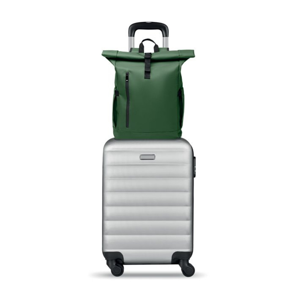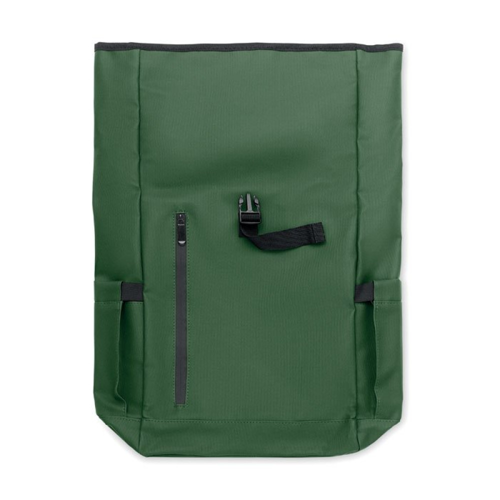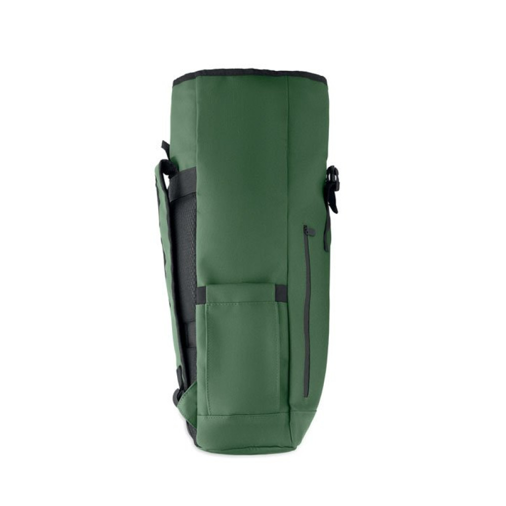 Рюкзак для ноутбука 15 дюймов из полиэстера RPET 600D с полиуретановым покрытием и подкладкой из полиэстера RPET. Сетчатая мягкая спинка с карманом на молнии и ремнем для переноски. Застежка ролл-топ. Мягкий плечевой ремень с сетчатой ​​отделкой внутри.
