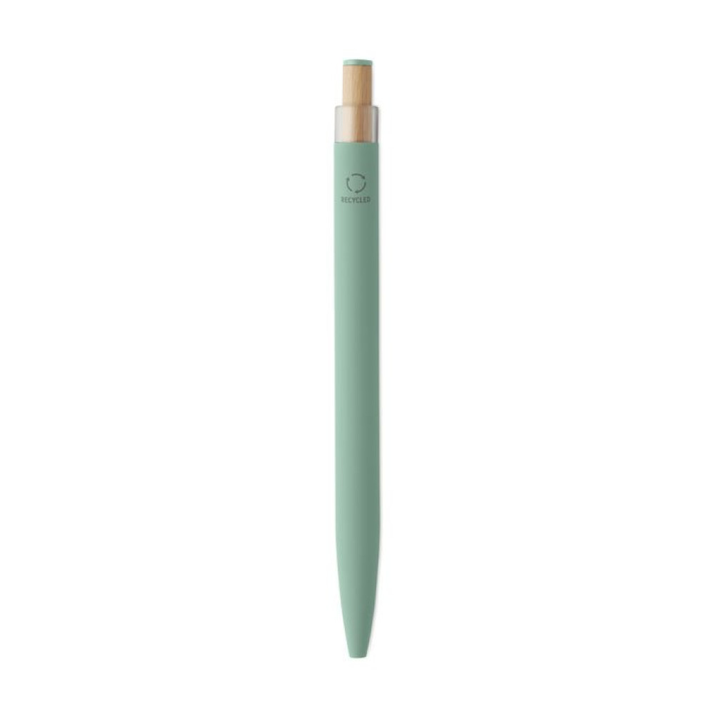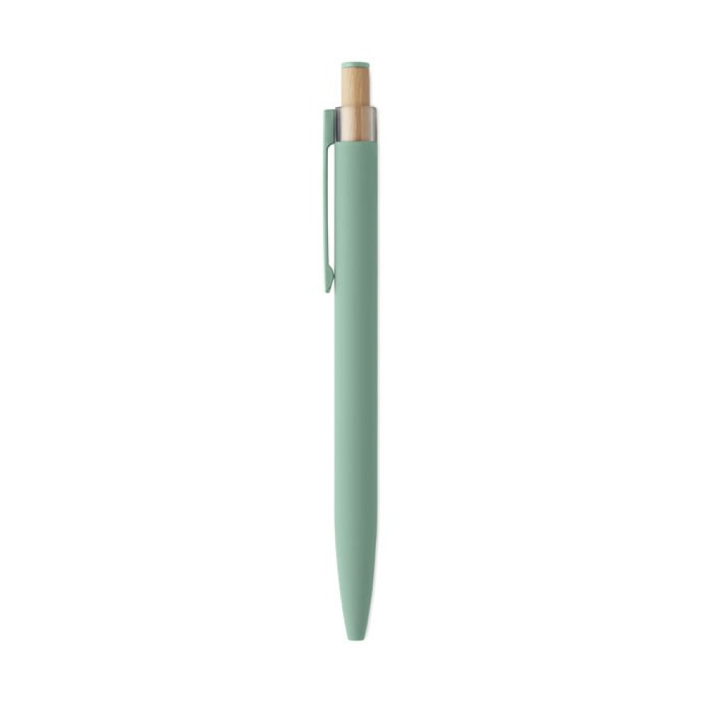 Шариковая ручка из переработанного алюминия с кнопкой из бамбука с цветными деталями и металлическим клипом. Синие чернила.