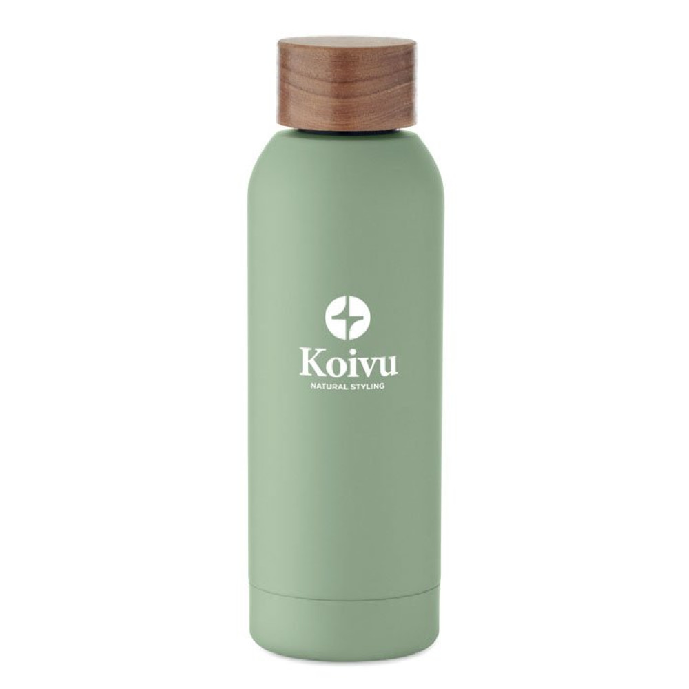 Термобутылка из переработанной нержавеющей стали 90% и 10% нержавеющей стали с резиновым покрытием и крышкой из древесины акации. Герметичная. Емкость: 700 мл. Стенки бутылки могут нагреваться.