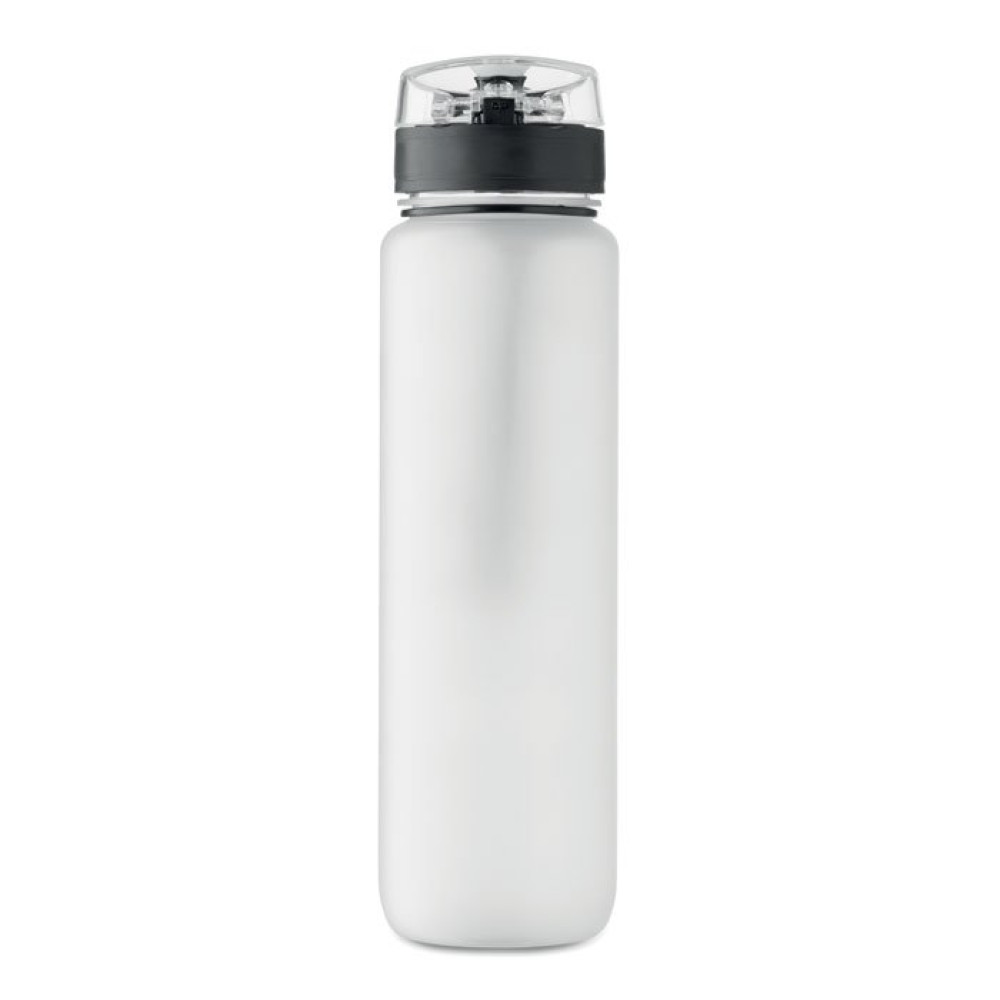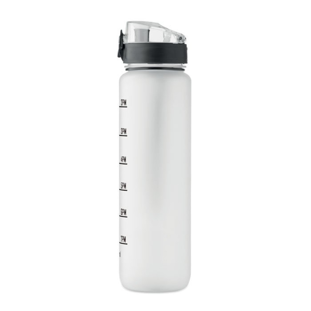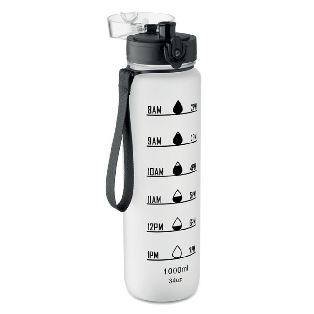 Спортивная бутылка из RPET с указанием графика потребления воды, откидной крышкой с предохранительным замком от открывания и ремешком для переноски. Герметичная. Емкость: 1 л.