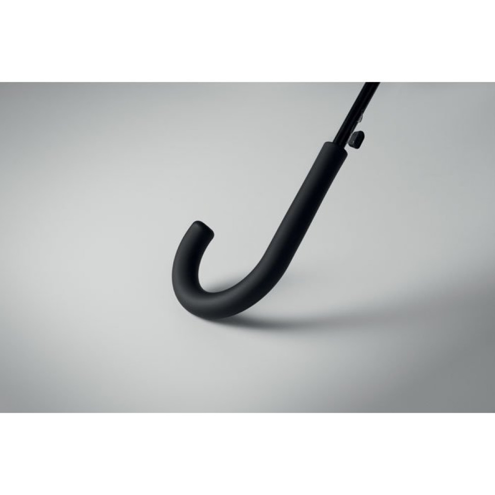 23-дюймовый полуавтоматический зонт из эпонжа 190T с металлическим каркасом и спицами из стекловолокна. Пластиковый наконечник. Изогнутая ручка из прорезиненного полипропиленового пластика.