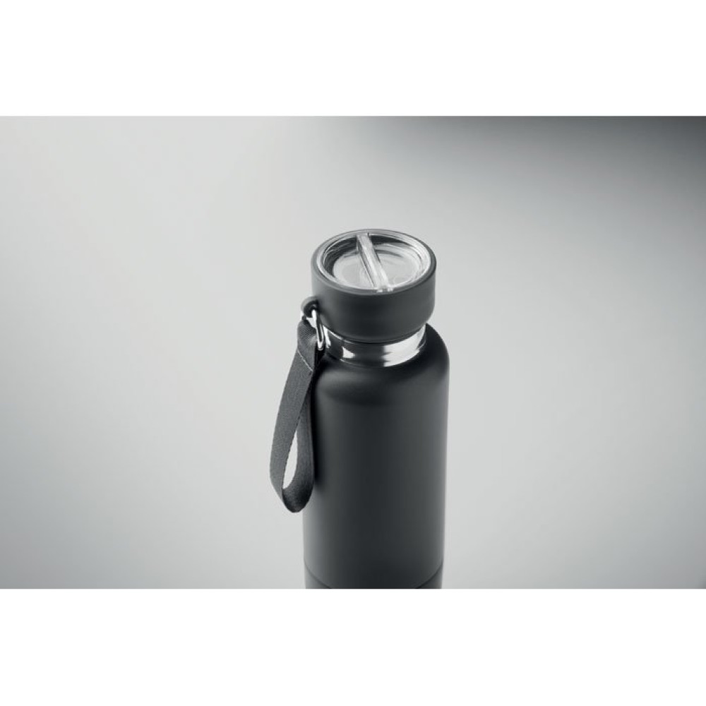 Термобутылка с двойной изоляцией из 90% переработанной нержавеющей стали и 10% нержавеющей стали с ручкой-ремешком и дополнительным длинным ремнем (70 см) в крышке из полипропилена. Герметичная. В комплект входит чашка. Емкость: 500 мл.