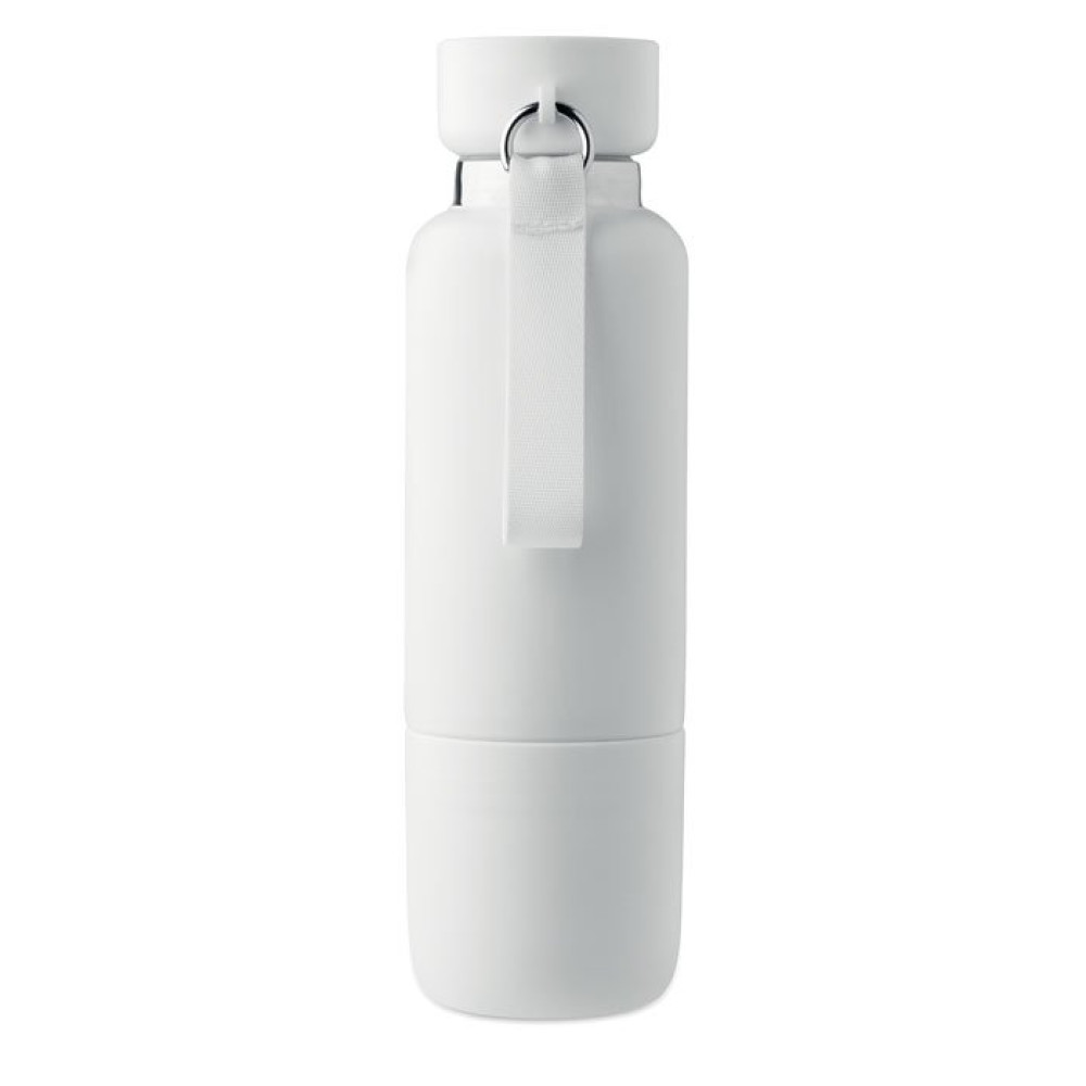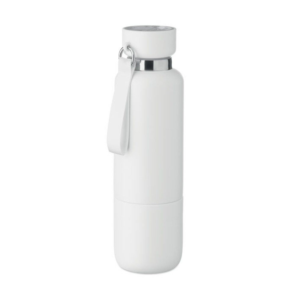 Термобутылка с двойной изоляцией из 90% переработанной нержавеющей стали и 10% нержавеющей стали с ручкой-ремешком и дополнительным длинным ремнем (70 см) в крышке из полипропилена. Герметичная. В комплект входит чашка. Емкость: 500 мл.
