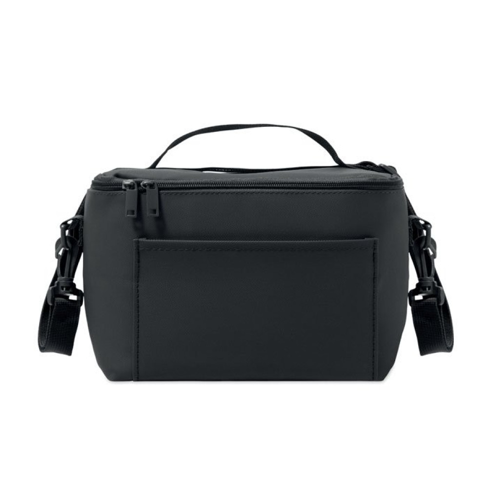 Термосумка из полиуретана с подкладкой из RPET 100 г. 1 передний карман, ручка и плечевой ремень. Изоляционная часть из пенополиэтилена и PEVA. Объем 5,5 л.