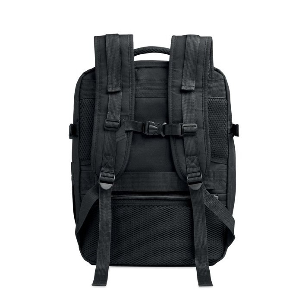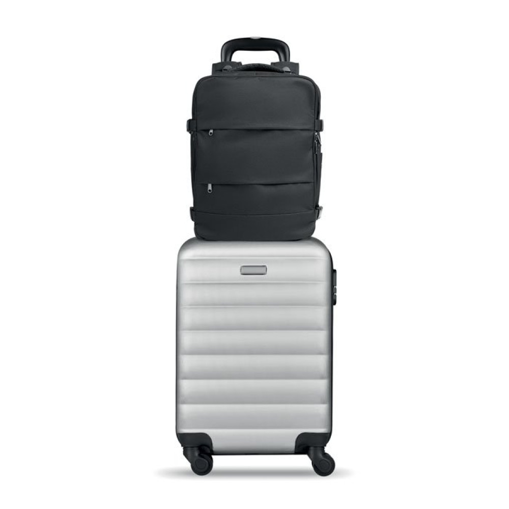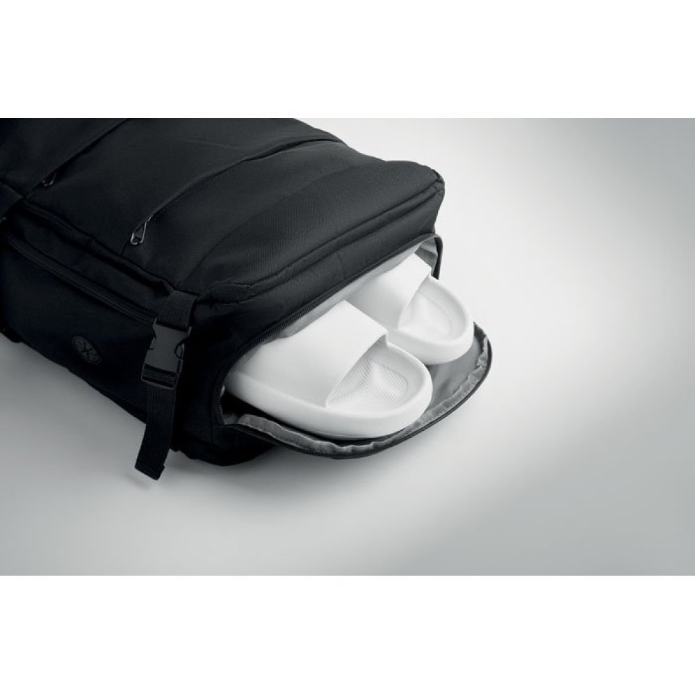 Рюкзак-трансформер для ручной клади из полиэстера RPET 600D с полиуретановой подкладкой. Включает отделение для обуви, мягкий карман для ноутбука 15 дюймов, багажный ремень и боковые застежки.