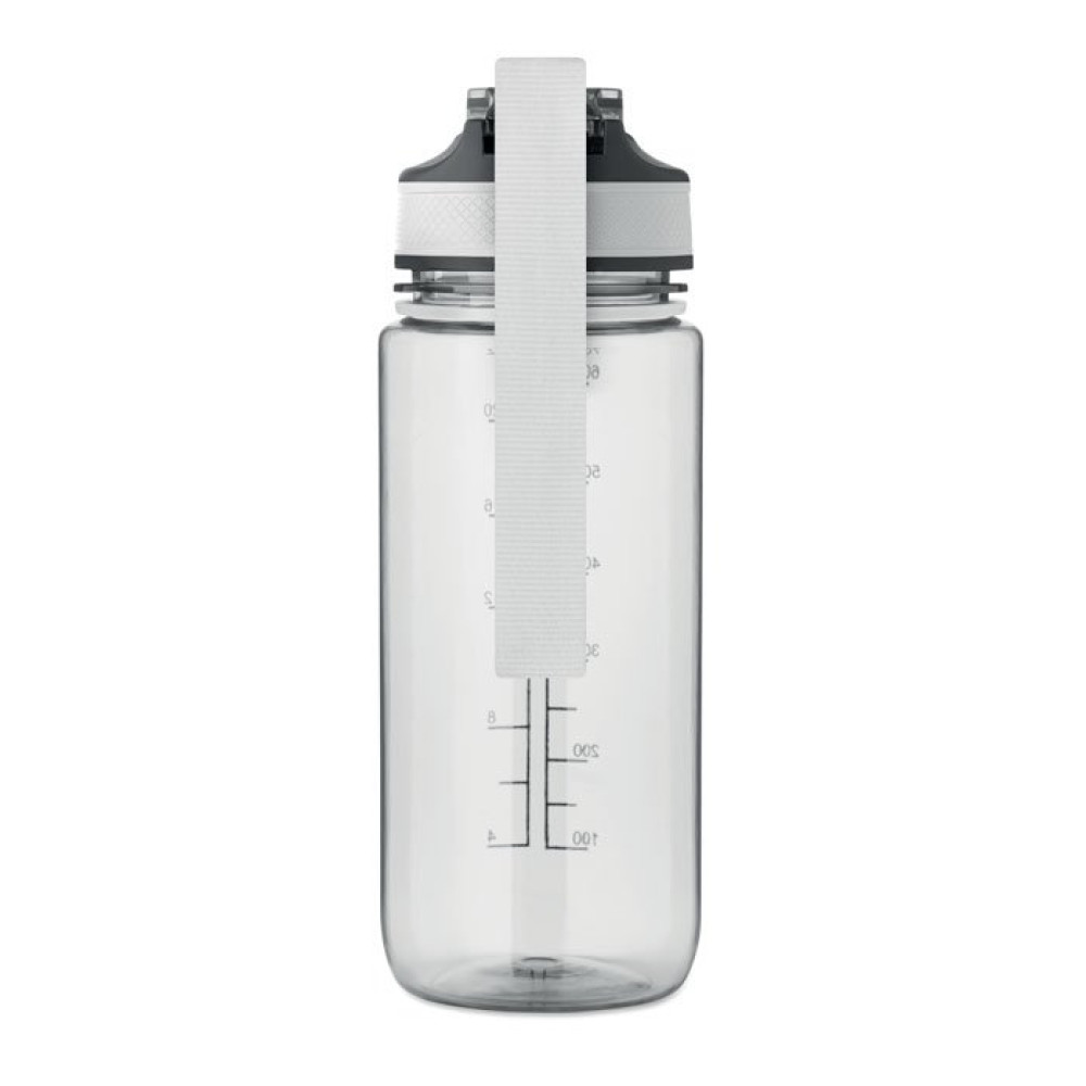Спортивная бутылка для воды из RPET со встроенной трубочкой, откидной крышкой, открывающейся одной рукой, предохранительным замком и ремешком для переноски из RPET. Объем 700 мл. Герметичная.