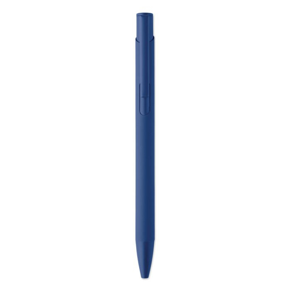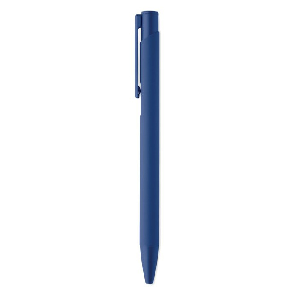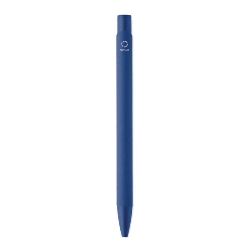 Ручка с кнопочным механизмом из переработанного алюминия с металлическим зажимом и цветным прорезиненным корпусом. Синие чернила.