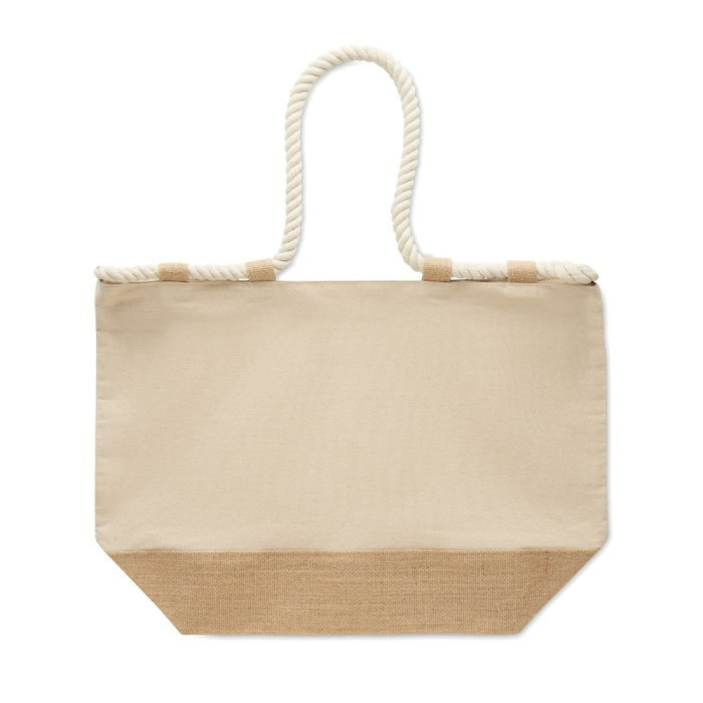 Пляжная сумка из парусины плотностью 280 г/м² и джута с плетеными ручками. Застегивается на молнию.
