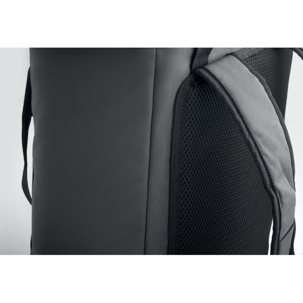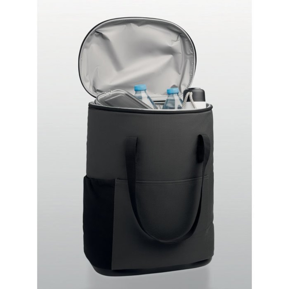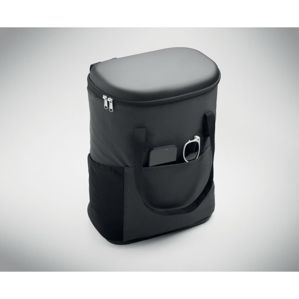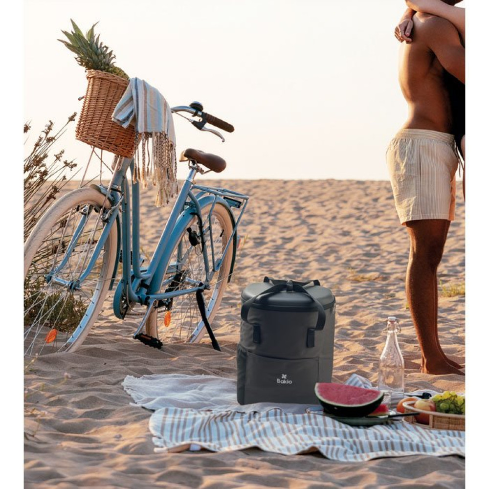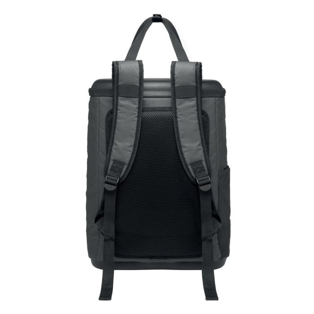 Рюкзак-кулер из водоотталкивающего полиэстера 600D с пенополиэтиленовой изоляцией и подкладкой из PEVA. Формованная крышка, мягкая сетчатая спинка, передний карман на молнии и боковые сетчатые карманы. Объем 20 л.