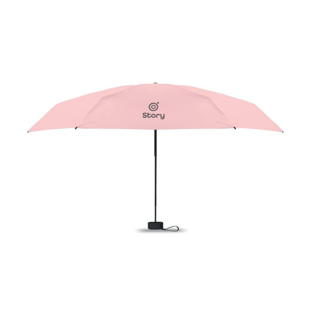 19-дюймовый складной зонт из полиэстера 190T в чехле. Ветроустойчивый каркас из металла и стекловолокна, черная прорезиненная ручка с ремешком на запястье. Компактный размер в сложенном виде 17 см.