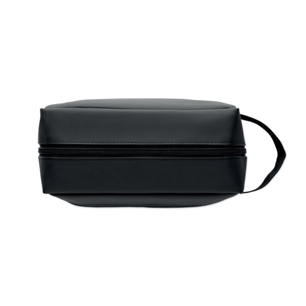Косметичка из полиэстера RPET 600D с полиуретановым покрытием и подкладкой из RPET 210D. Имеет передний карман на молнии и ручку.