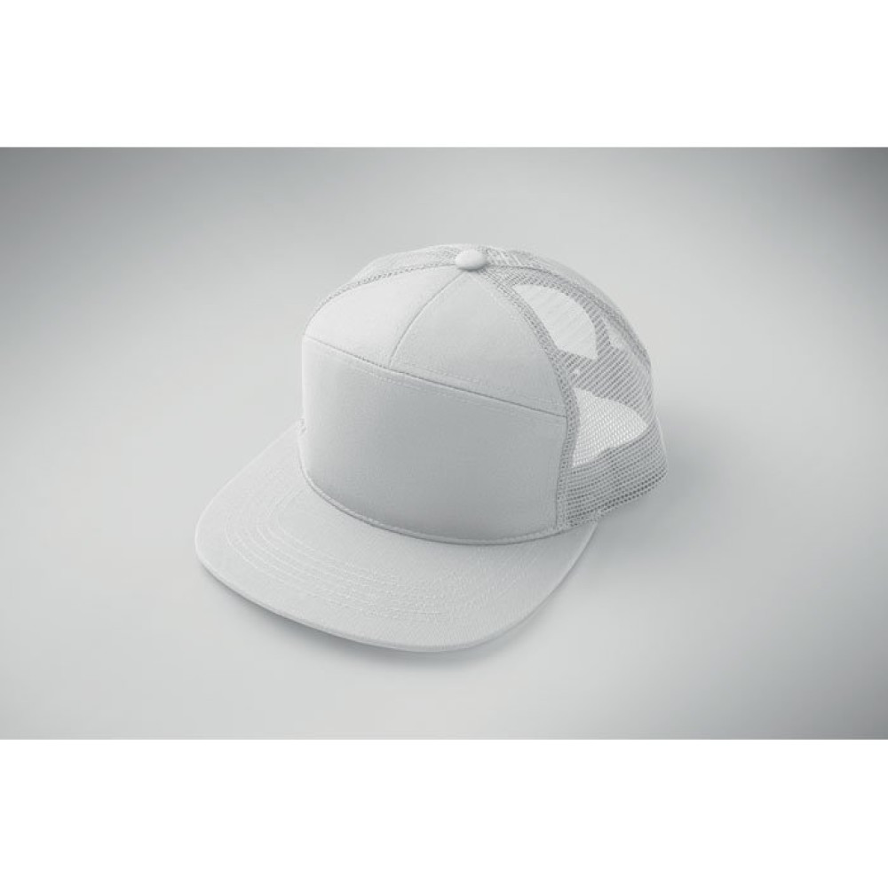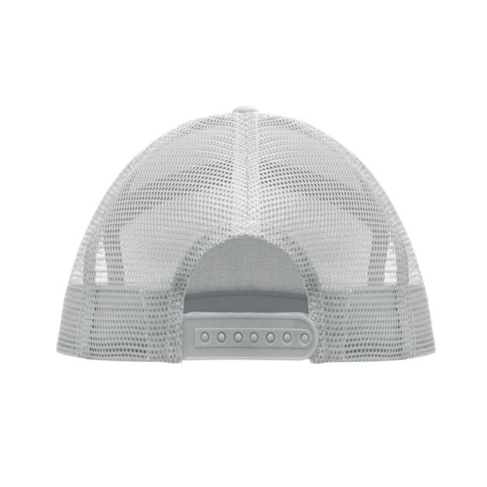 Бейсболка с плоским козырьком из хлопка 235 г/м² с сетчатой задней частью из полиэстера и пластиковой застежкой.