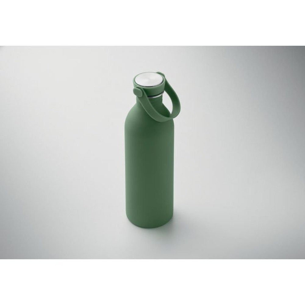 Одностенная бутылка из 90% переработанной нержавеющей стали и 10% нержавеющей стали с резиновым покрытием. Крышка из полипропилена и нержавеющей стали с силиконовой ручкой. Объем: 500 мл.