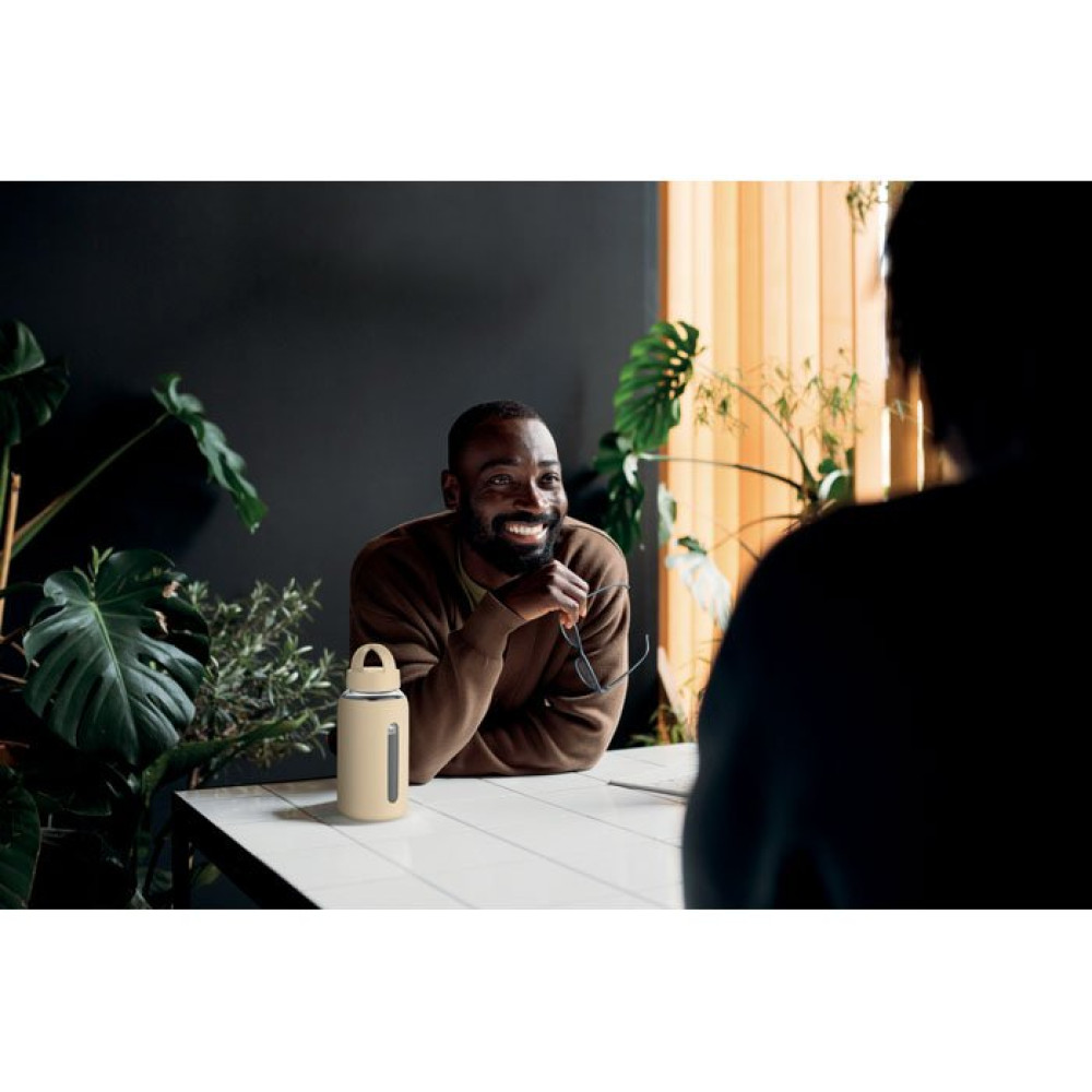 Бутылка из прочного боросиликатного стекла с силиконовым чехлом и крышкой с ручкой. Объем: 600 мл.