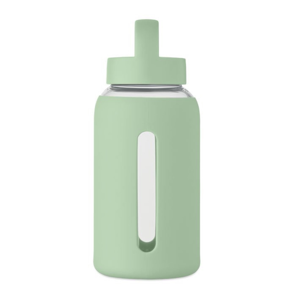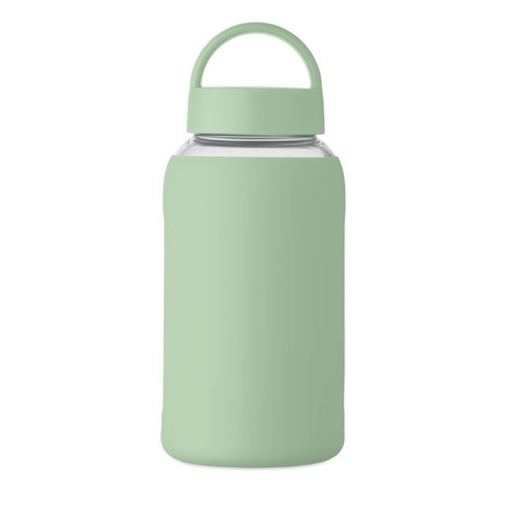 Бутылка из прочного боросиликатного стекла с силиконовым чехлом и крышкой с ручкой. Объем: 600 мл.