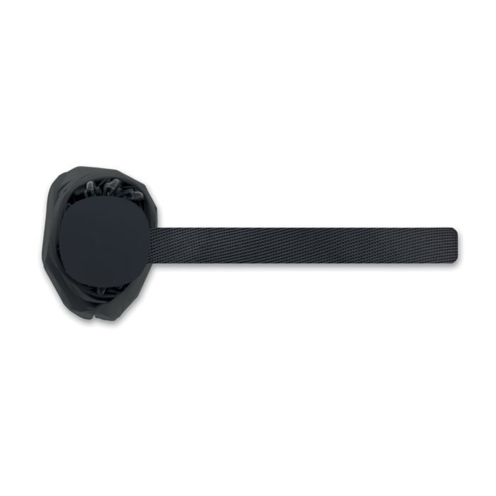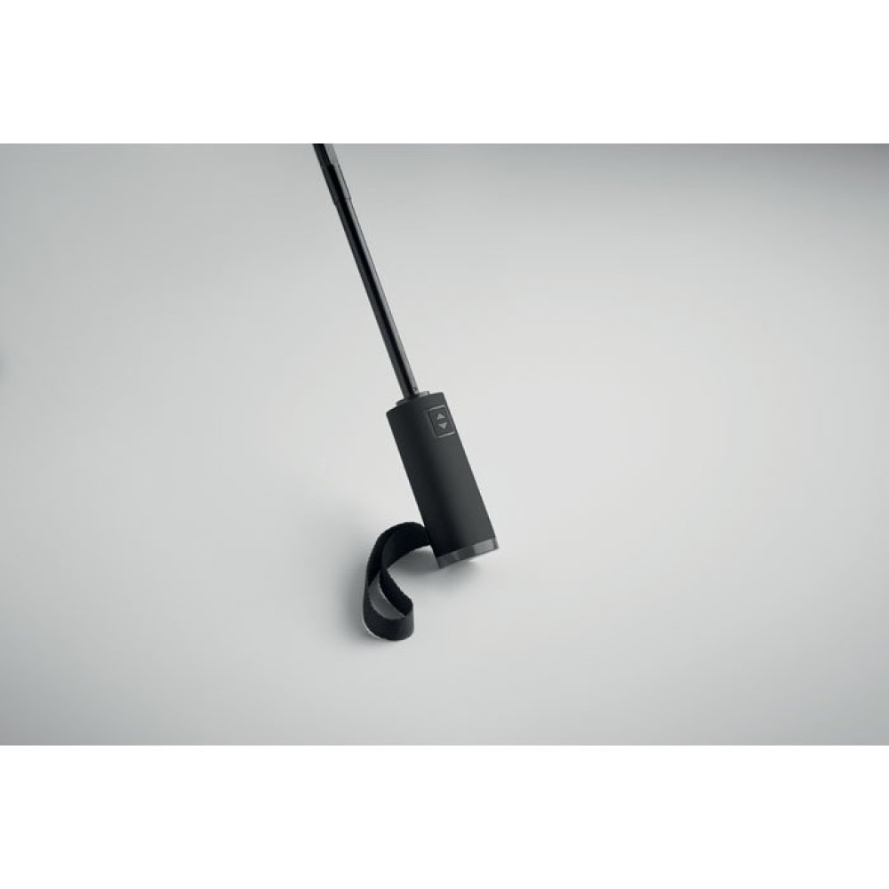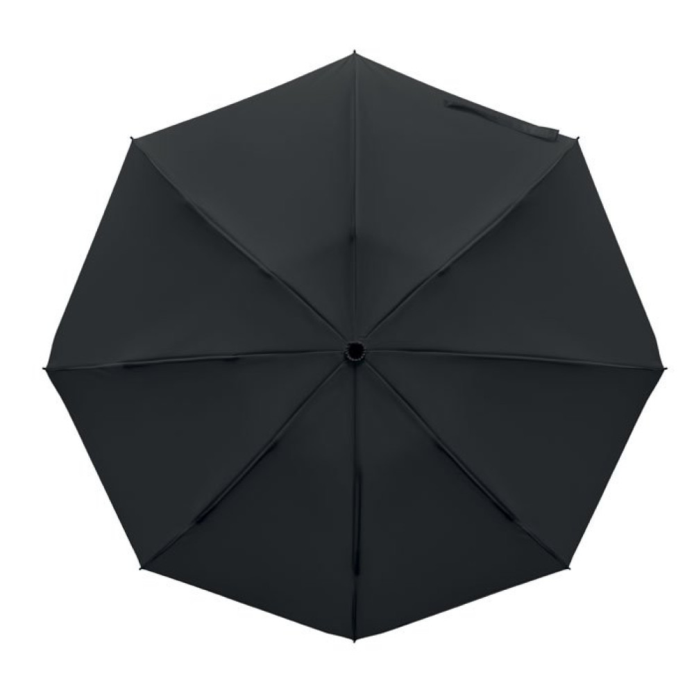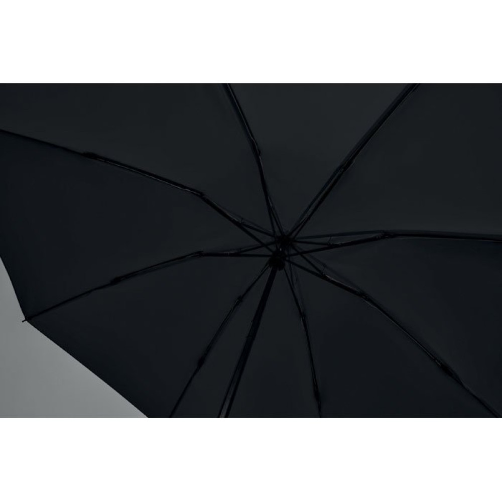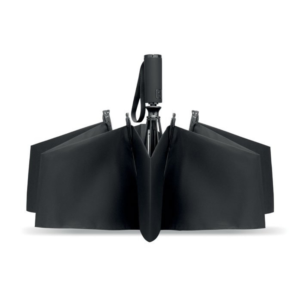 23-дюймовый реверсивный ветроустойчивый зонт автомат из полиэстера 190T RPET в чехле. Полностью черный каркас, спицы из стекловолокна и ручка из пластика с резиновым покрытием.