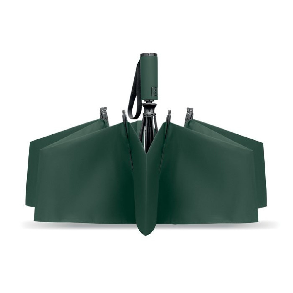 23-дюймовый реверсивный ветроустойчивый зонт автомат из полиэстера 190T RPET в чехле. Полностью черный каркас, спицы из стекловолокна и ручка из пластика с резиновым покрытием.