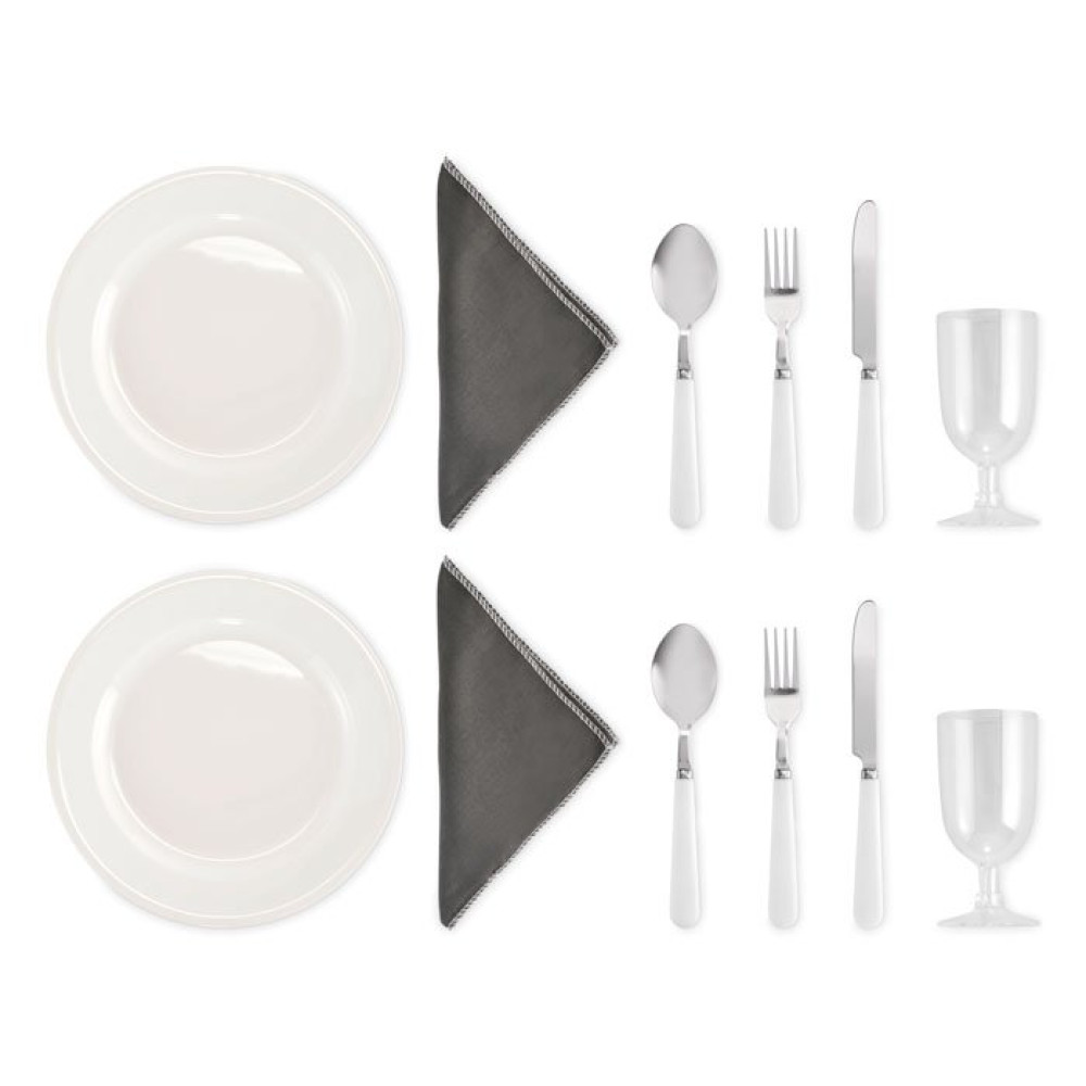 Сумка-кулер для пикника из RPET 600D на 2 персоны с передним карманом на молнии. В комплекте столовые приборы из нержавеющей стали, 2 тарелки и 2 стакана из полистерола, 2 хлопковые салфетки. Объем: 18 л.