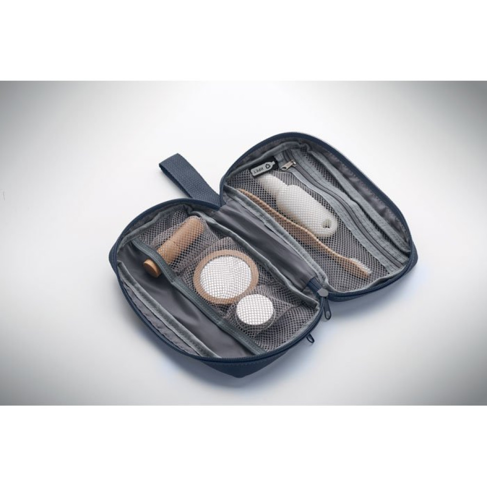 Косметичка из RPET 600D с полиуретановым покрытием. Передний карман на молнии, открытые карманы и внутренний сетчатый карман.