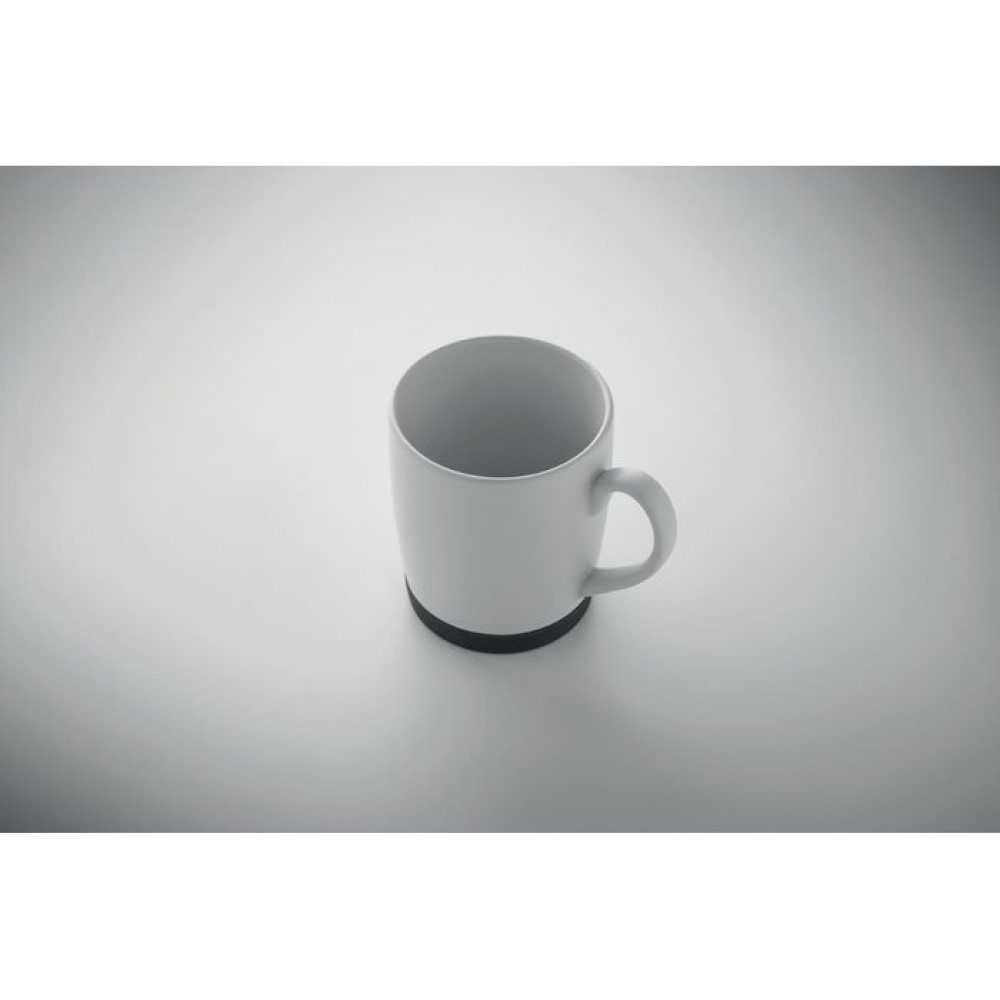 Керамическая кружка с белой матовой поверхностью и силиконовым нескользящим основанием. Объем 300 мл. Индивидуальная упаковка в белую картонную коробку.