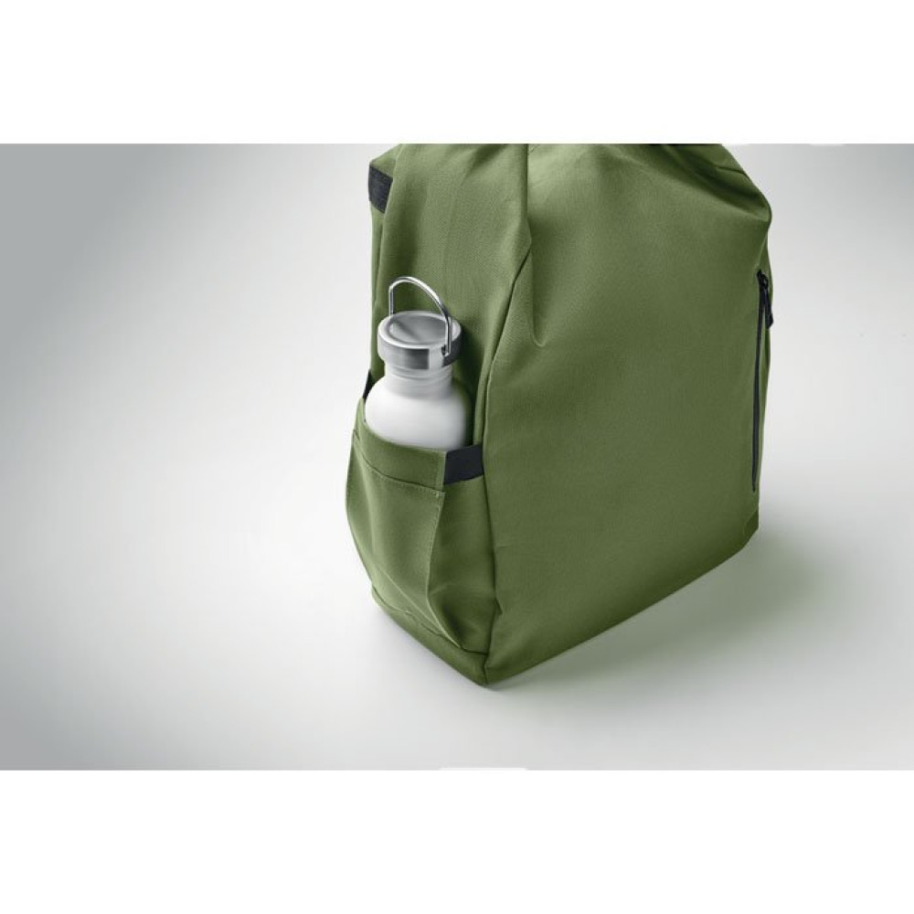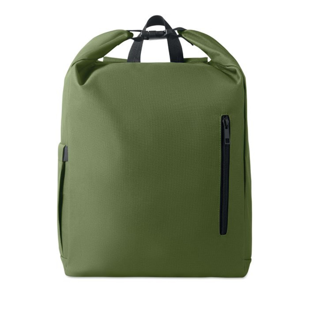 Рюкзак для ноутбука 15 дюймов из полиэстера RPET 600D с мягкой подкладкой из RPET 210D и застежкой ролл-топ. Имеет передний карман на молнии, эластичный боковой карман и регулируемые плечевые ремни.