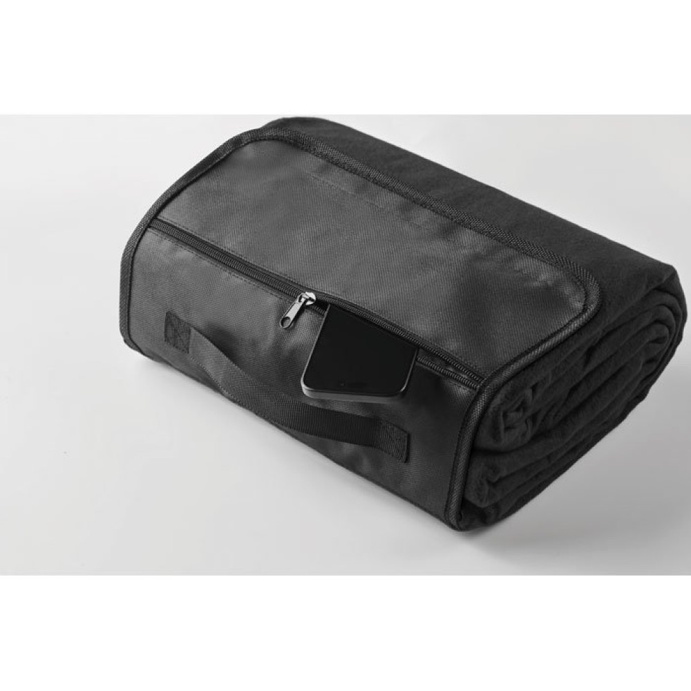 Плед для пикника из флиса RPET 150 г/м² (68% переработанный полиэстер/32% обычный полиэстер) с водоотталкивающим покрытием PEVA с обратной стороны. Спереди карман на молнии и ручка.