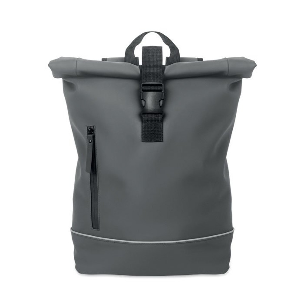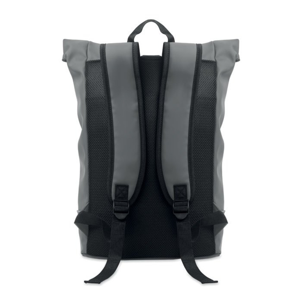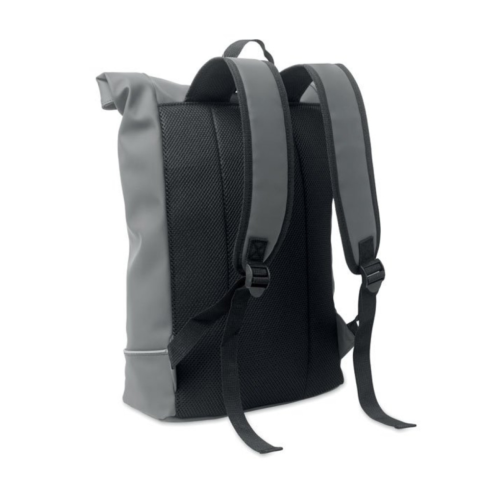 Рюкзак для ноутбука 15 дюймов из мягкого полиуретана с застежкой rolltop и светоотражающей полосой. Мягкая спинка, усиление дна, водонепроницаемый передний карман на молнии. Подкладка из полиэстера 210D RPET.