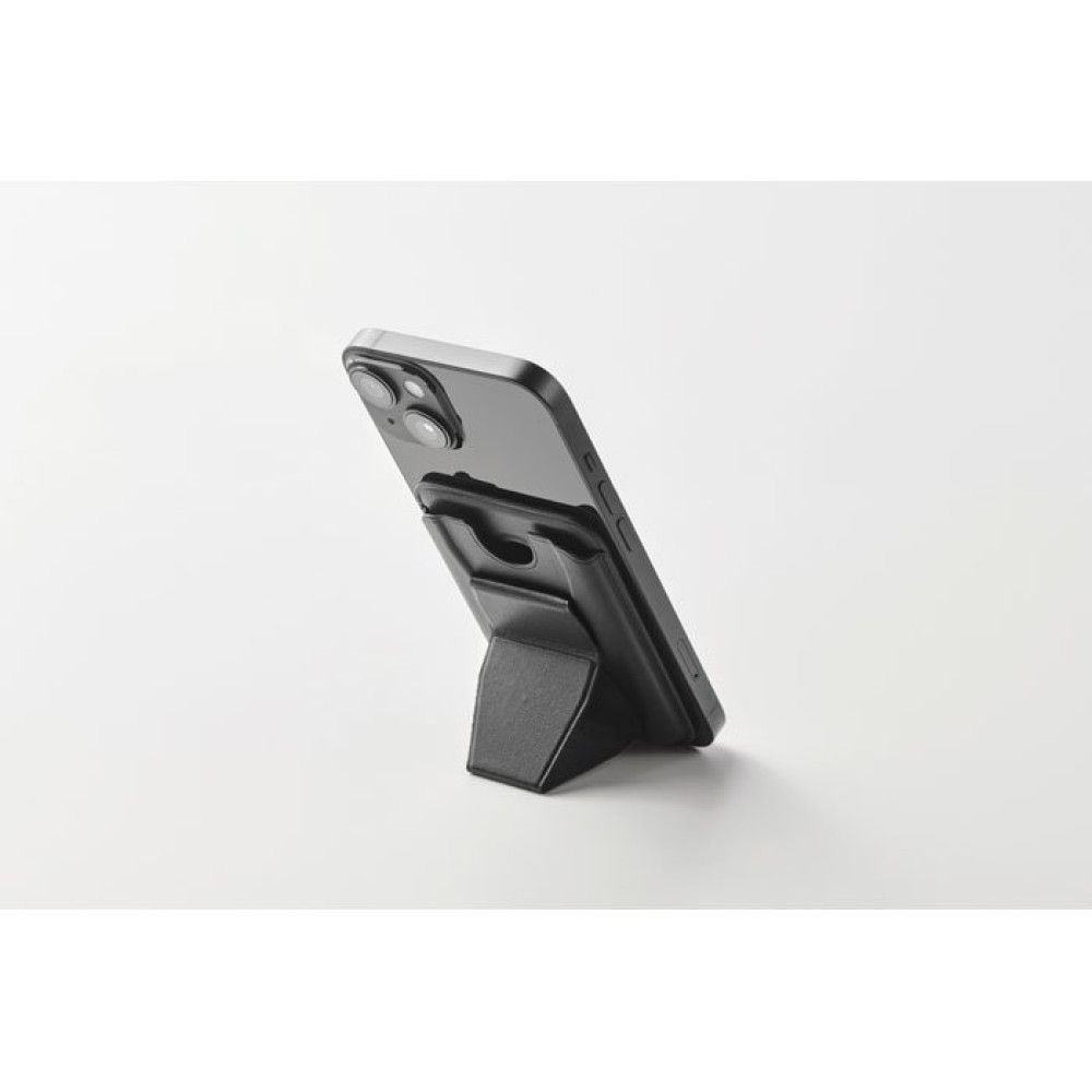 Чехол для карт из искусственной кожи (для 2 карт) с функцией подставки и магнитной застежкой. Подходит для iPhone® 12 и новее. Включает магнитное металлическое кольцо для зарядки других немагнитных беспроводных устройств.